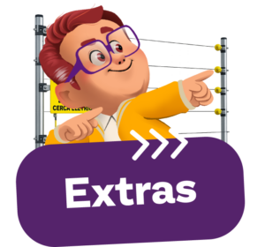 Cerca elétrica: arames, isoladores, conectores e hastes, e central de choque (Energizador).